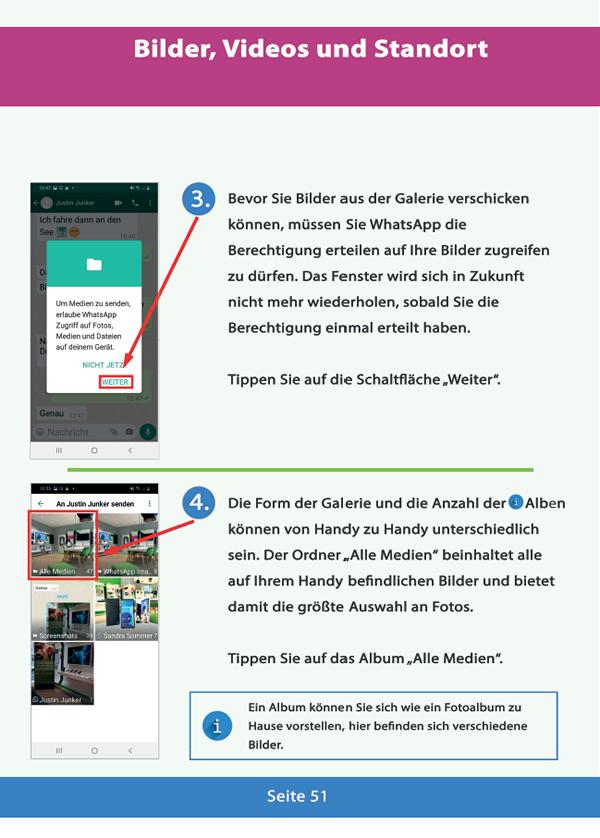 Aus diesem Grund haben wir ein übersichtliches A4-Format gewählt, in dem wir große Bilder und Text miteinander vereinen können. Die themenbezogene Nummerierung der verschiedenen Schritte verbindet Theorie mit Praxis und kann sofort am eigenen Handy nachgebildet werden. Die Notizseiten nach jedem Themengebiet unterstützen diesen Lernprozess positiv.